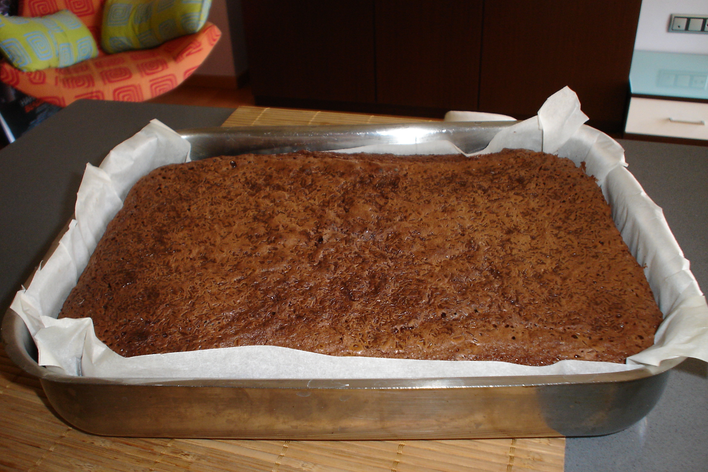 – Se mezcla todo con la batidora. Se cubre una rustidera con papel vegetal y se vierte la mezcla. Esparce por encima la viruta de chocolate antes de meterlo, y hornea unos 45′ a 180º C.