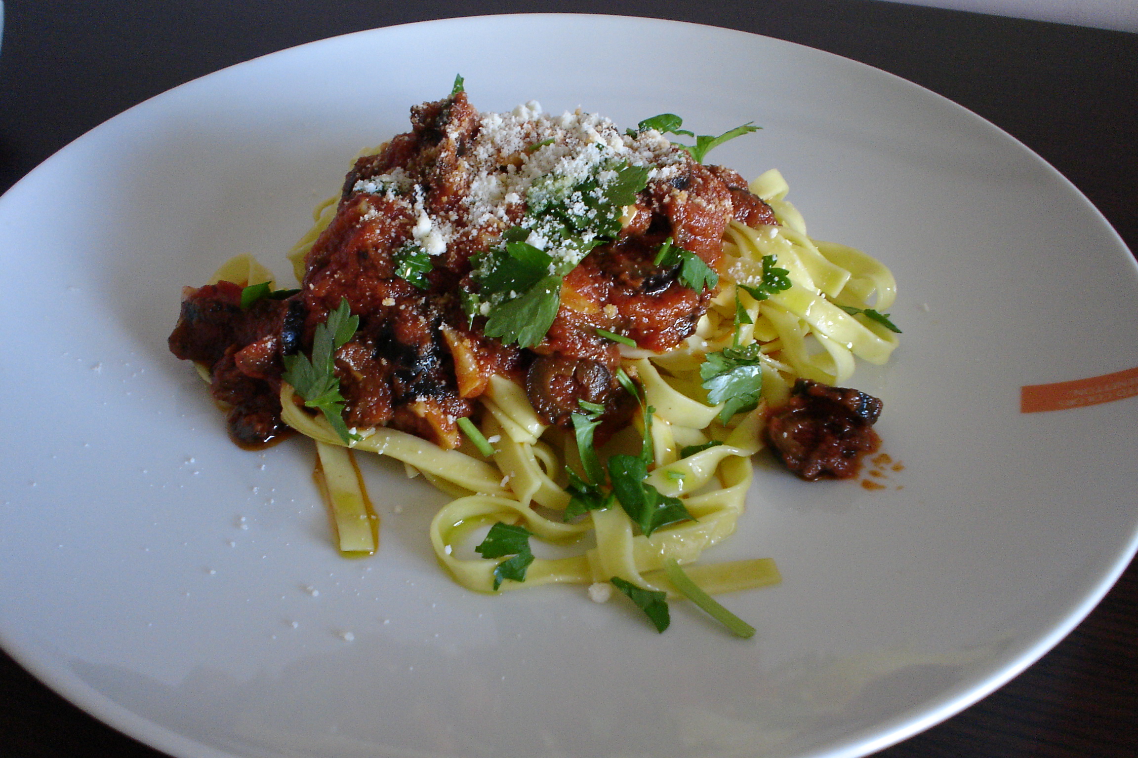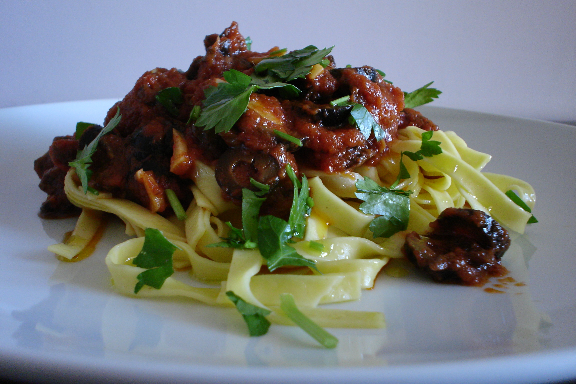 Mi primera salsa putanesca. Que rica por dios… Eso sí, no hace falta echarle ni una pizca de sal. He sustituido de la receta original (más bien he eliminado) las alcaparras, ya que me parecía demasiado fuerte la combinación anchoa-oliva negra-tápena. A ver que os parece.