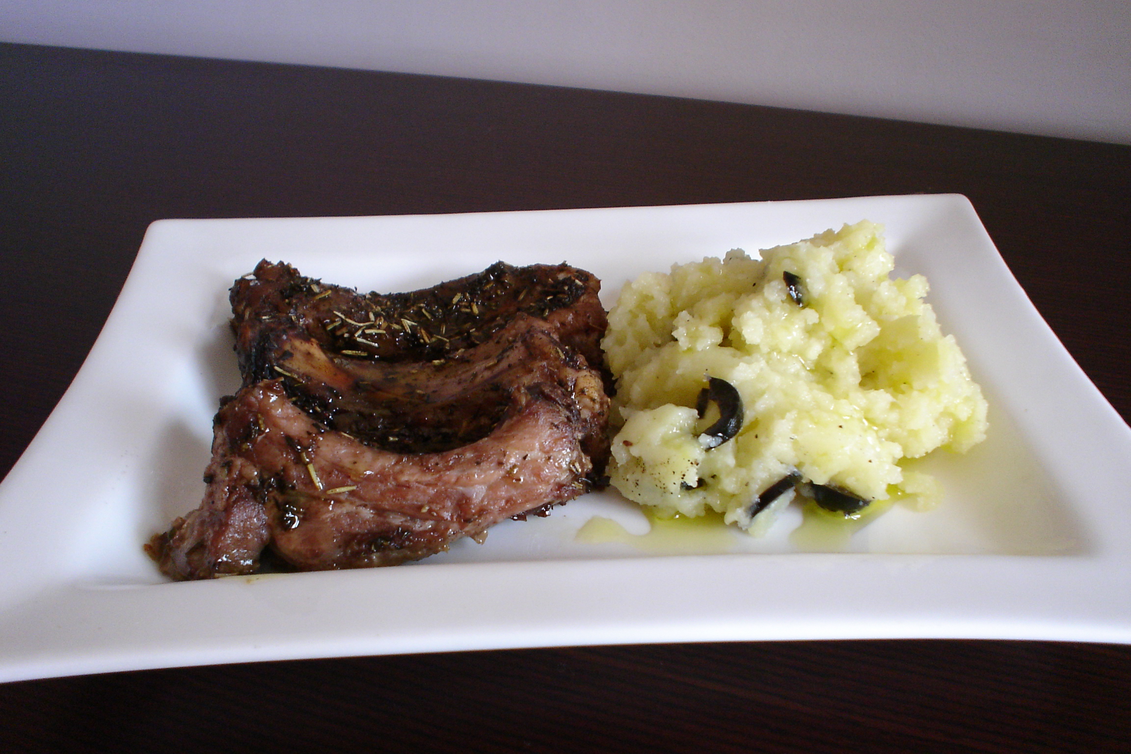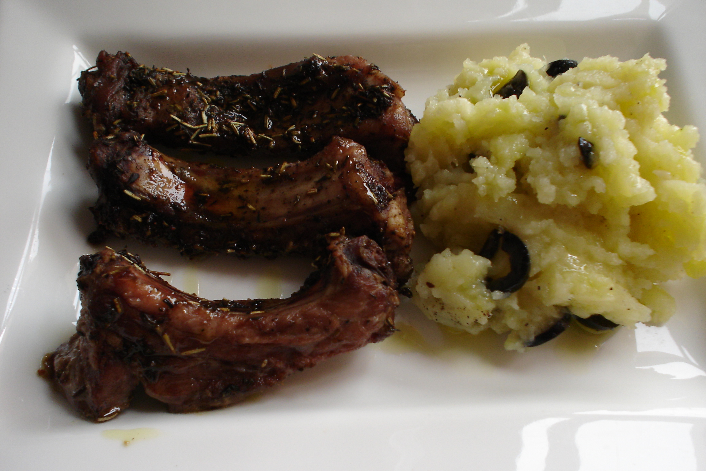 En la receta que usé para crear esta versión de costillas las servían con manzana asada en la misma fuente del costillar. Aunque no soy muy fan de las patatas, he preferido usarlas en formato de puré de olivas negras aquí porque echarle manzanas me parecía abusar del sabor dulce con la miel y la fruta. ¡Ya me contaréis que os parecen mis costillas!