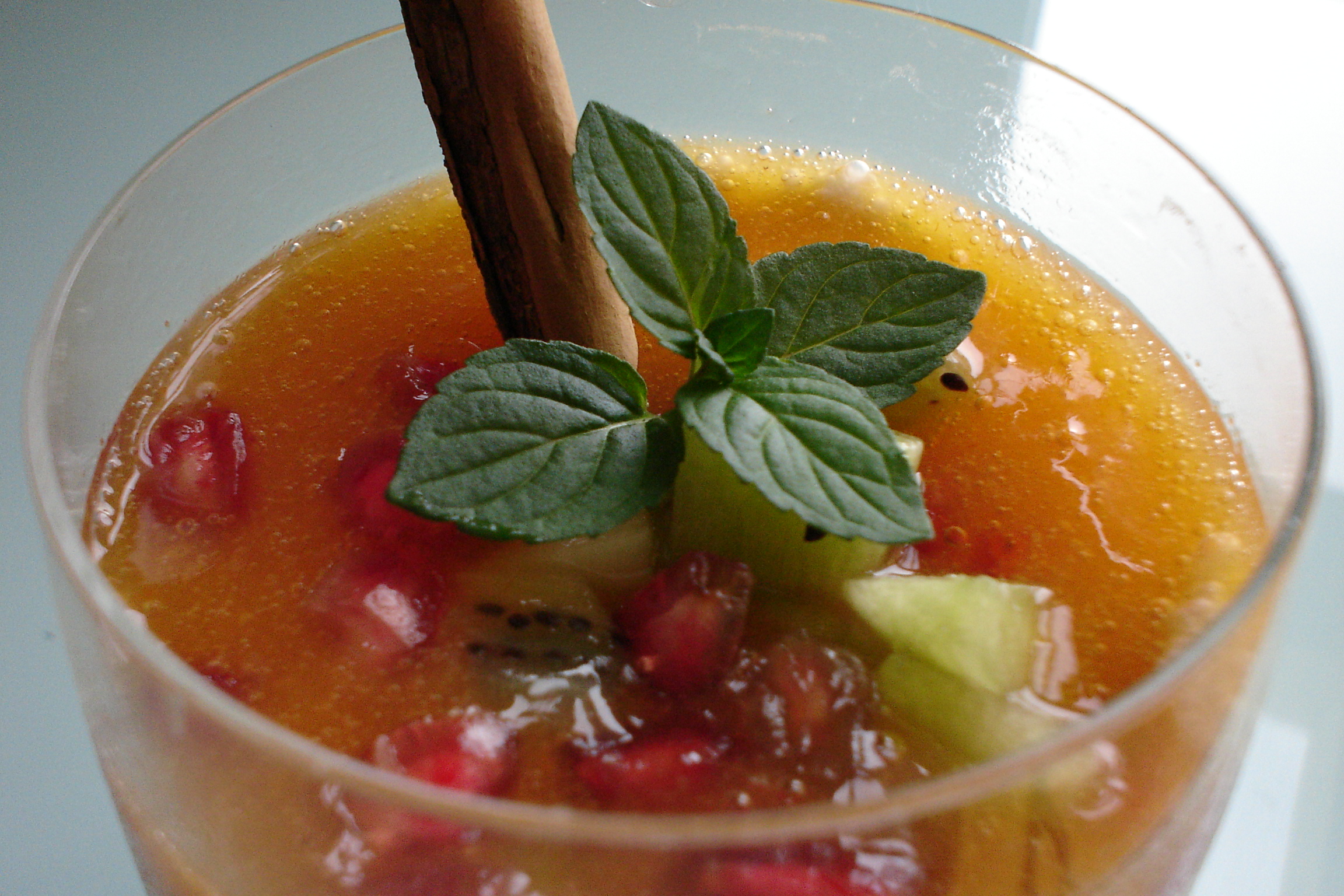 – En la última, añade la granada, el kiwi y un ramillete de menta. Clava una rama de canela y resérvalo en el frigorífico hasta su consumo.