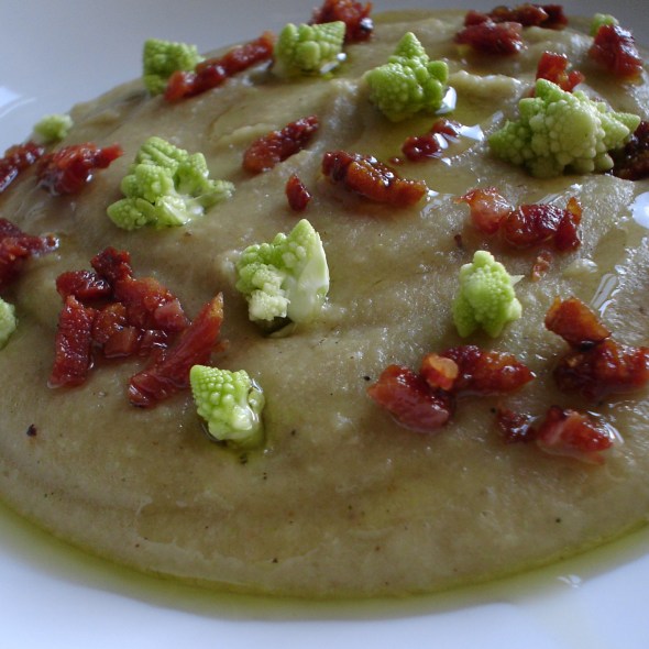 Puré de castañas caramelizadas con romanescu y crujiente de bacon